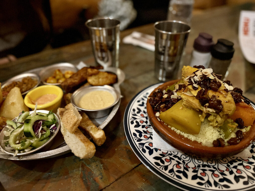 Aquí probé un plato con varios entrantes típicos como hummus y zaalouk, ensalada marroquí de berenjenas asadas y un couscous de pollo. Además, pedí té y pasteles. Cenamos por unos 8 euros por persona.