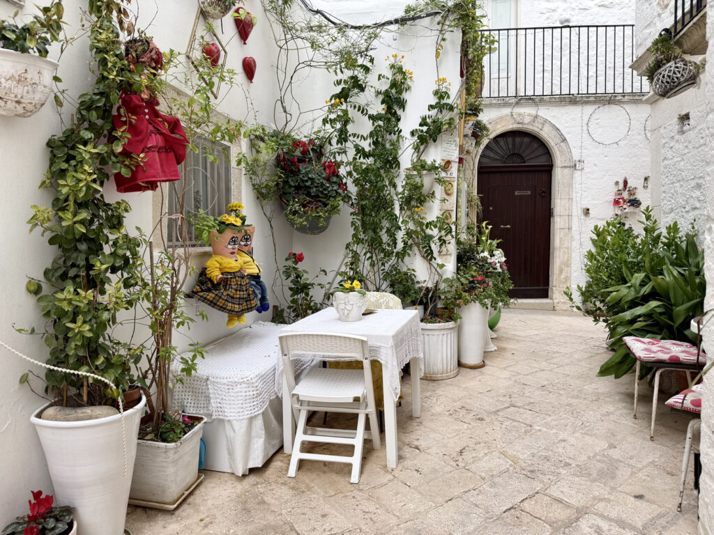 Aunque en casi todos los pueblos de alrededor los vecinos también engalanan sus calles con artesanía, en Locorotondo encontrarás decoración a cada paso. Lo mejor es perderse y dejarse llevar mientras paseas para descubrir rincones tan bonitos como este.