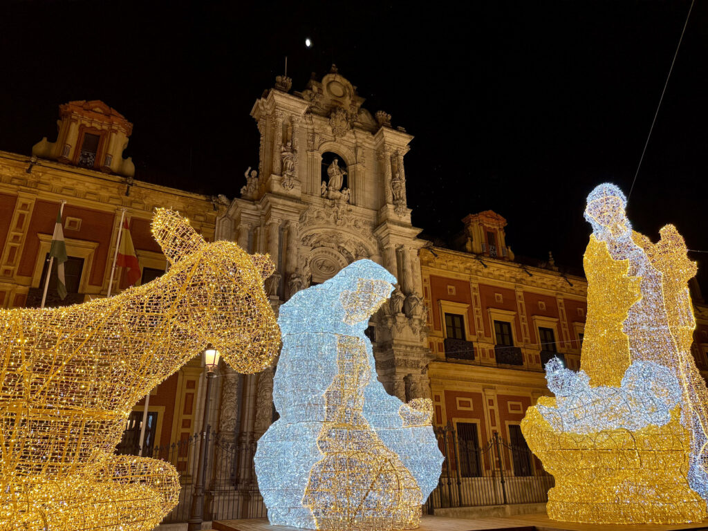 En los últimos años, el Palacio de San Telmo también se ha convertido en una parada obligada en Sevilla en Navidad. En 2025, puedes ver instalado un Portal de Belén gigante, considerado el belén iluminado más grande de España.